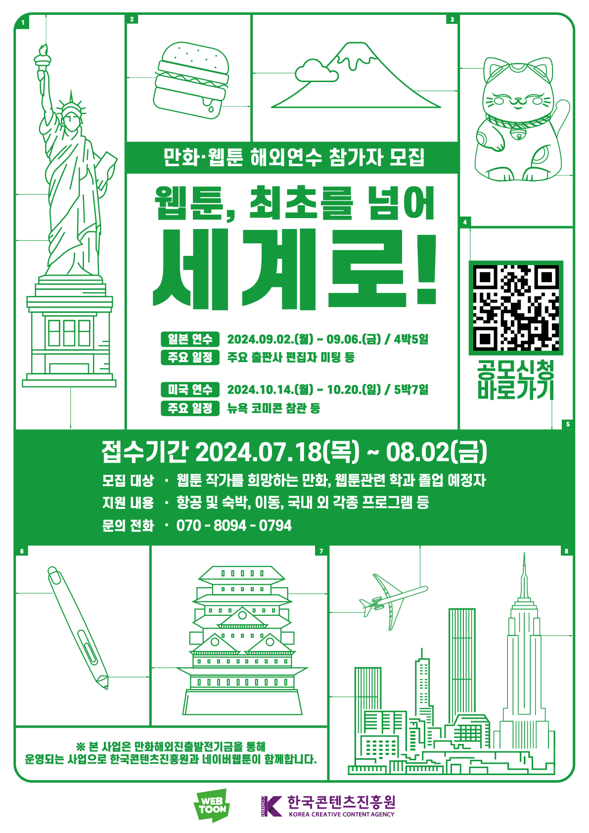 네이버웹툰과 한국콘텐츠진흥원에서는 국내 만화·웹툰 업계 활성화와 체계적 해외 진출을 도모하기 위해 ‘만화·웹툰 관련학과 2025년 졸업예정자’를 대상으로「2024 만화·웹툰 해외 연수프로그램 참가자 모집」을 실시하오니 많은 관심과 참여를 바랍니다.
