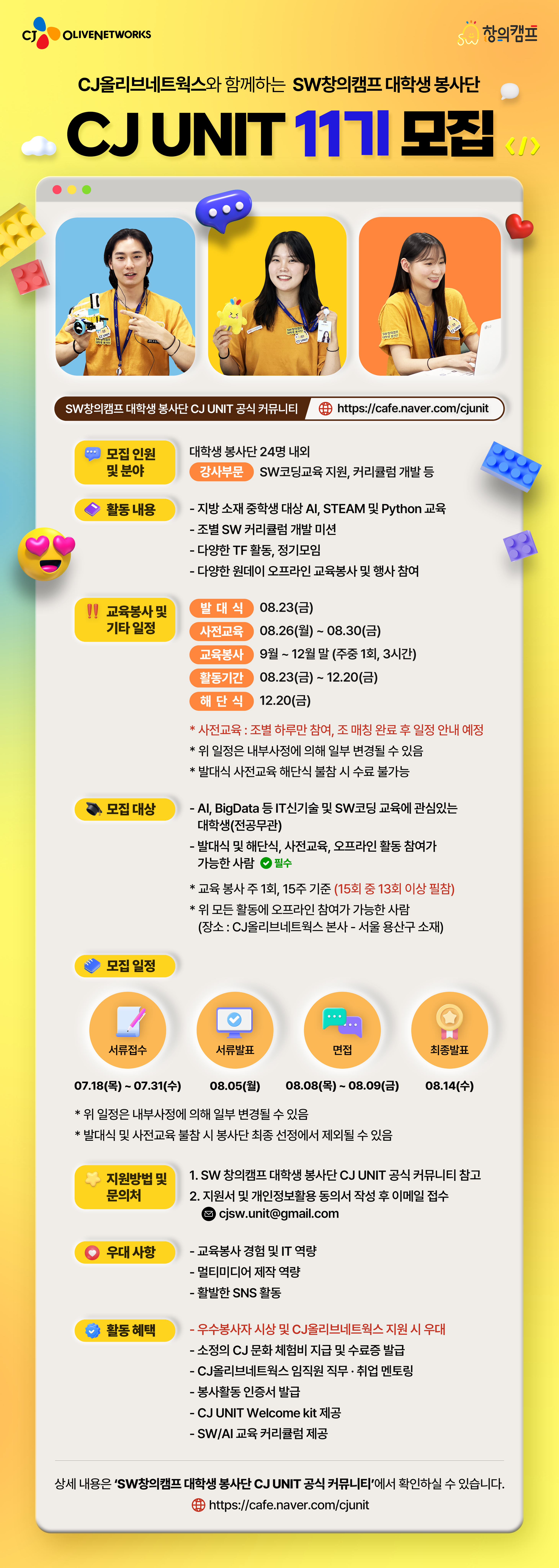 💛SW창의캠프 대학생봉사단 CJ UNIT 11기💛를 아래와 같이 모집합니다.
