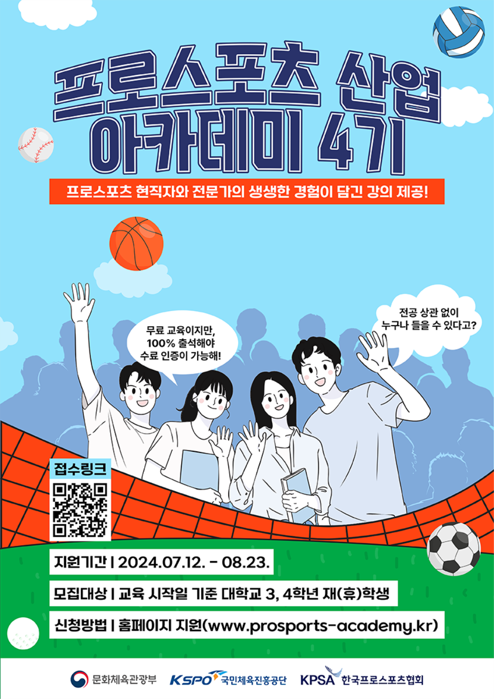 프로스포츠 산업 아카데미 수강생 모집(4기)📢 프로스포츠 산업 아카데미란? 프로스포츠 산업에 관심 있는 대학생 대상 교육으로, 프로스포츠 5개 종목(축구, 야구, 농구, 배구, 골프)을 아우르는 프로스포츠 산업 예비 인재 양성 프로그램입니다. 본 교육은 프로단체 및 구단의 운영, 홍보, 마케팅 등을 담당하는 실무진과 산업 전문가의 #현장 #실무 #최신 산업 트렌드 중심 강의로 구성됩니다.