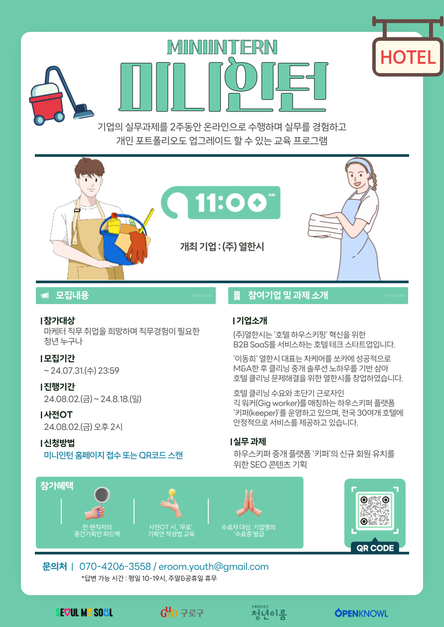 2주간 [호텔 테크 스타트업, (주)열한시] 의 실제 과제를 수행하면서 직무경험을 쌓고 역량강화를 통해 포트폴리오 업그레이드 하고 싶은 예비 마테터 분들 지금 바로 신청하세요: )