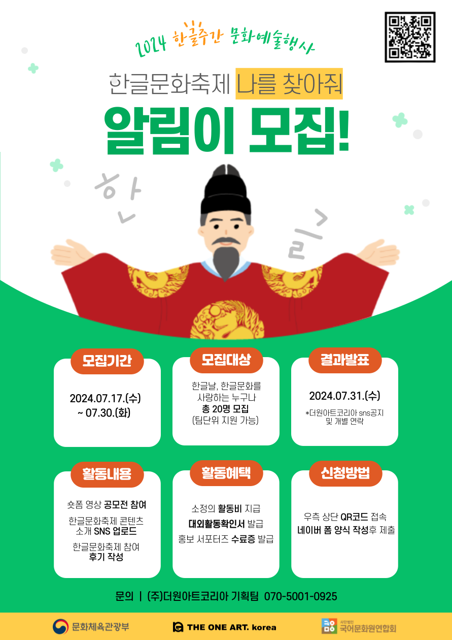 문화체육관광부에서 선정한 '2024 한글주간 문화예술행사'인 '한글문화축제 - 나를 찾아줘' 홍보 알림이를 아래와 같이 모집합니다.