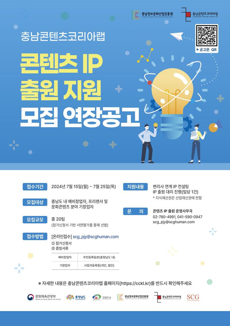 충남도 내 예비창업자, 프리랜서 및 기창업자를 대상으로 안정적 시장 진입을 위한 콘텐츠 IP 출원을 지원합니다. 많은 관심과 참여 바랍니다.