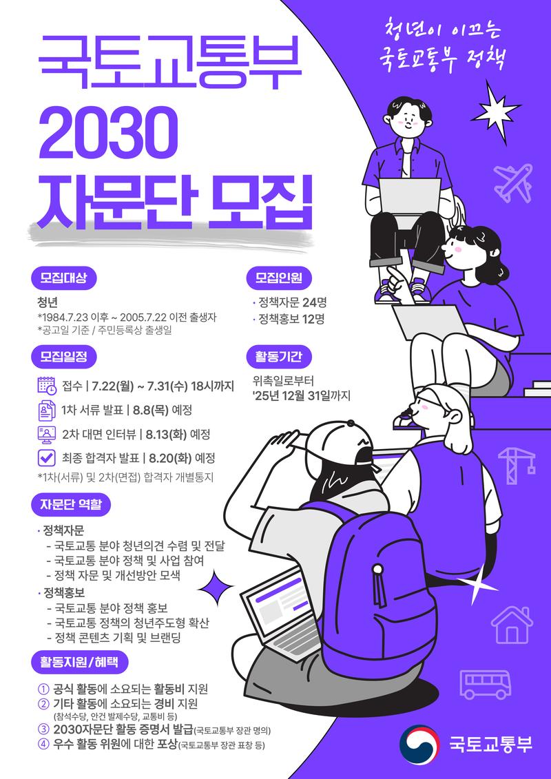 국토교통부는 국토교통 정책 전반에 청년세대의 인식을 전하는 핵심 창구 역할을 수행할 『제3기 국토교통부 2030자문단』을 아래와 같이 공개 모집하오니 많은 참여 바랍니다.