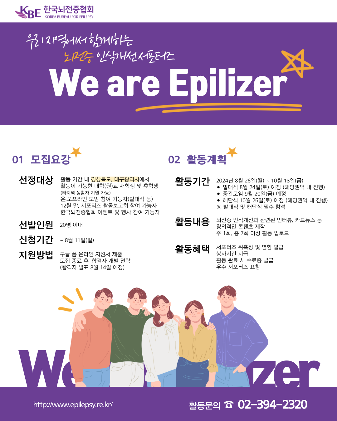 한국뇌전증협회에서 뇌전증에 대해 함께 알아가며, 부정적인 사회 인식을 개선해나갈 제19기 서포터즈 “We are Epilizer”를 다음과 같이 모집하오니 많은 참여 바랍니다.