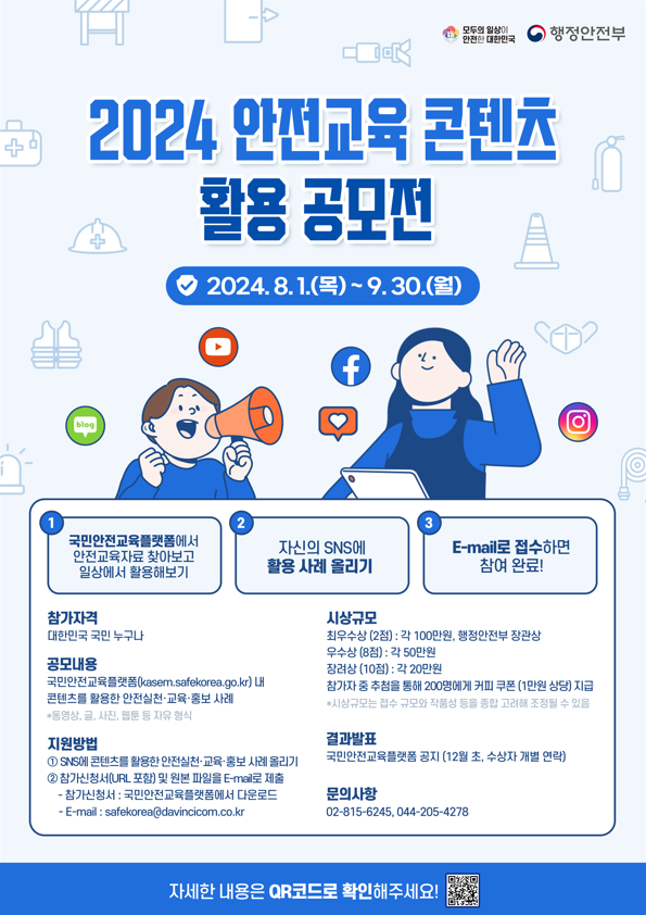 안전교육 콘텐츠를 국민이 일상에서 직접 활용하고 홍보함으로써 콘텐츠 활용도를 높이고, 국민의 안전의식 함양을 지원하기 위해 '2024년 안전교육 콘텐츠 활용 공모전'을 추진하오니, 많은 관심과 참여 바랍니다.