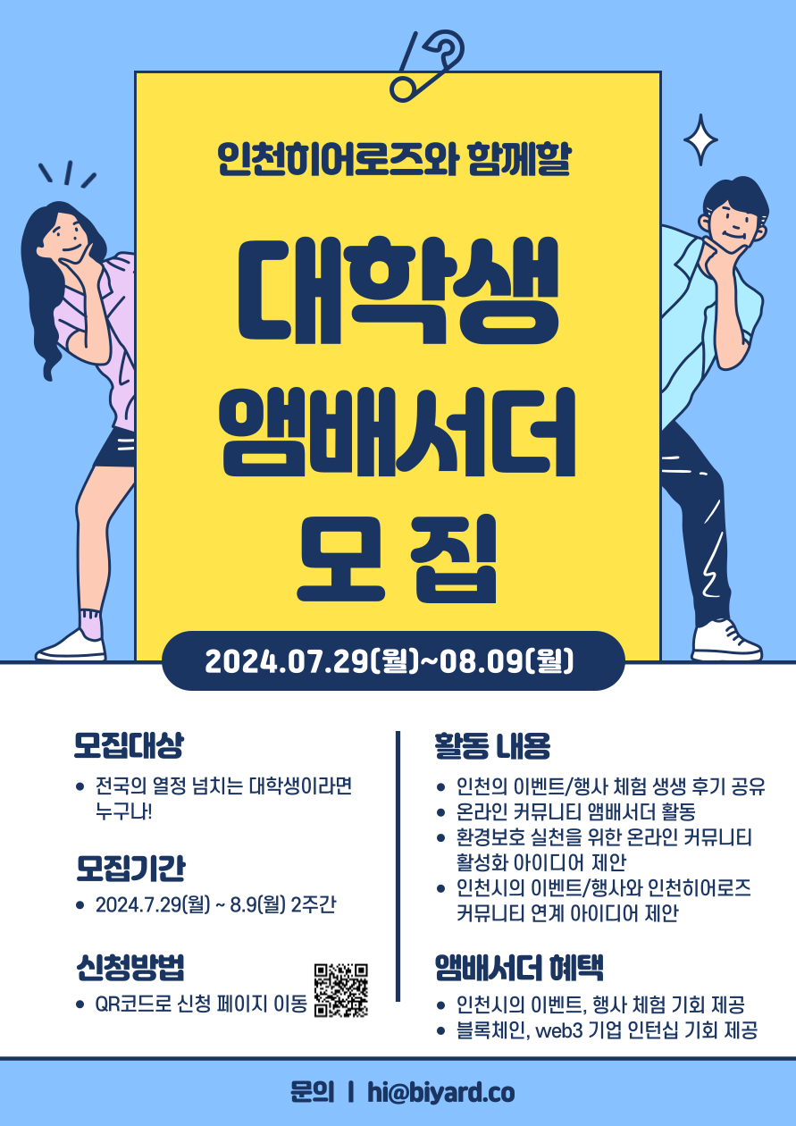 대학생 앰버서더로서 인천히어로즈를 홍보하고, 다양한 인천시의 이벤트와 행사에 참여하며, 커뮤니티를 성장시키는 데 기여하고 싶은 대학생이라면 누구든 인천히어로즈와 함께할 수 있습니다.