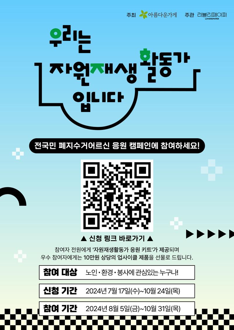 -혜택 : 참가자 전원에게 폐지수거어르신 응원 키트 제공 및 우수 참여자에 10만원 상당의 업사이클 제품 제공