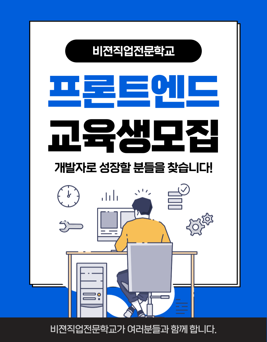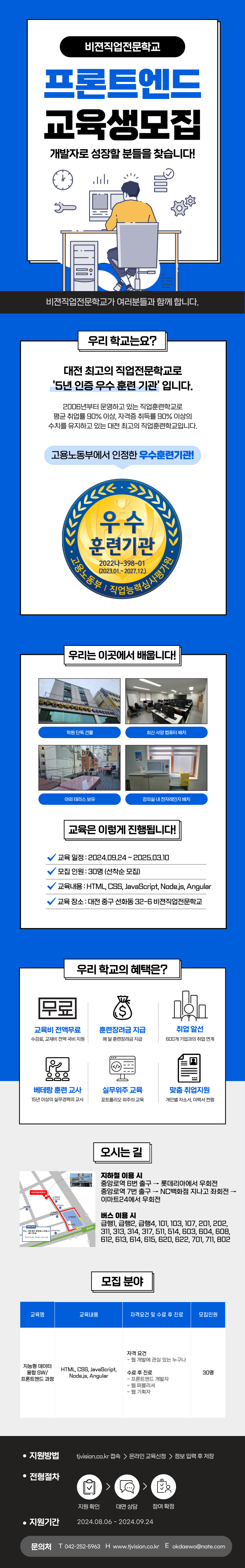 비젼직업전문학교 홈페이지 접속(tjvision.co.kr) -> 교육신청 or 온라인교육신청 클릭 -> 수강희망과목에 [디지털컨버전스]데이터융합SW/프론트엔드과정(A) 선택 후 접수