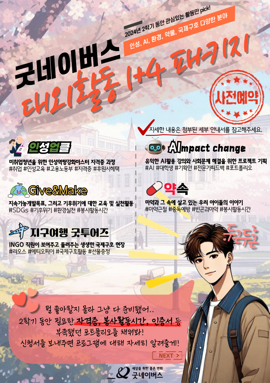 - 굿네이버스는 눈앞의 미래세대를 이끌어갈 대학생을 대상으로 SDGs, 인성교육, 기후위기, 중독예방, AI 및 사회문제해결 등에 대한 다양한 역량강화 프로그램을 진행하고 있습니다. 이에 모집 대상자 대비 신청자가 많은 주요 프로그램에 대한 24년도 2학기 사전신청을 받고자 하오니 많은 관심과 참여 부탁드립니다.