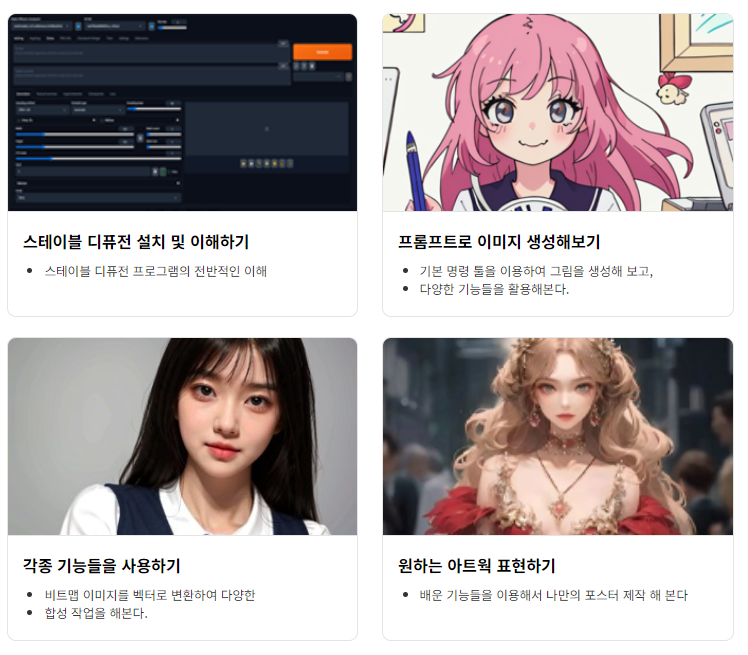 누구나 간단한 명령어를 입력하여 고품질의 이미지를 생성하여 그것을 바탕으로 다양한 시각디자인 분야에서 활용할 수 있는 방법을 배웁니다. 다양한 활용 예제를 통해 프로그램의 활용 능력과 스킬을 키울 수 있습니다. 그림을 전문적으로 배우지 않아도 실사 이미지부터 다양한 그림 스타일의 이미지를 생성하고 수정하여 필요한 곳에 사용할 수 있게 능력을 키웁니다.