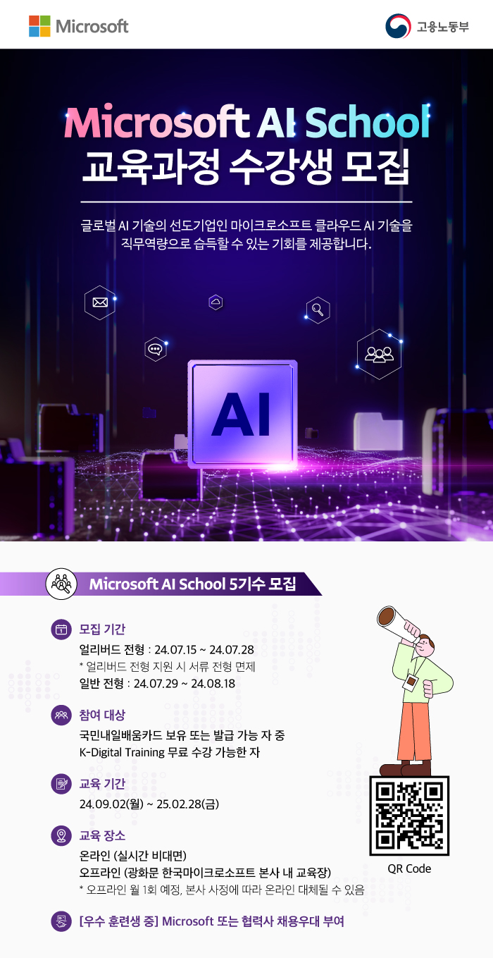- Microsoft AI School은 AI·디지털·데이터 등 미래 신기술 교육과 현장 중심의 실무프로젝트를 중점 수행하며, 청년과 기업이 원하는 양질의 일자리를 연결하는 디지털 인재양성 프로그램입니다.