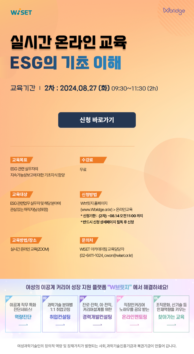 한국여성과학기술인육성재단(WISET)은 ESG에 대한 교육수요가 급증함에 따라, WISET과 BSI그룹코리아가 공동으로 ESG와 관련한 업무를 수행하는 재직자의 실무 능력 배양을 위한 과정을 마련하였으니 많은 분들의 관심과 신청 바랍니다.