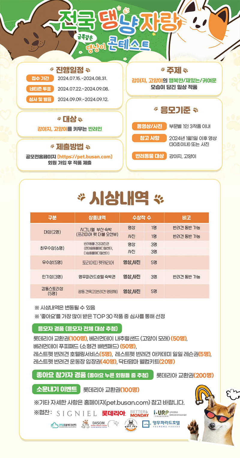 30초 이내(1080X1920 권장) 반려동물 영상을 개인 유튜브 채널에 업로드 후 홈페이지 접수