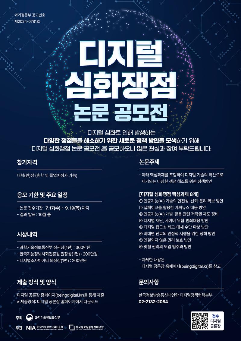 과학기술정보통신부에서 새로운 디지털 질서 정립에 대한 국민 관심 유발 및 정책 방안에 관한 우수 연구·아이디어 발굴을 위해 ‘디지털 심화쟁점 논문 공모전’을 개최합니다.