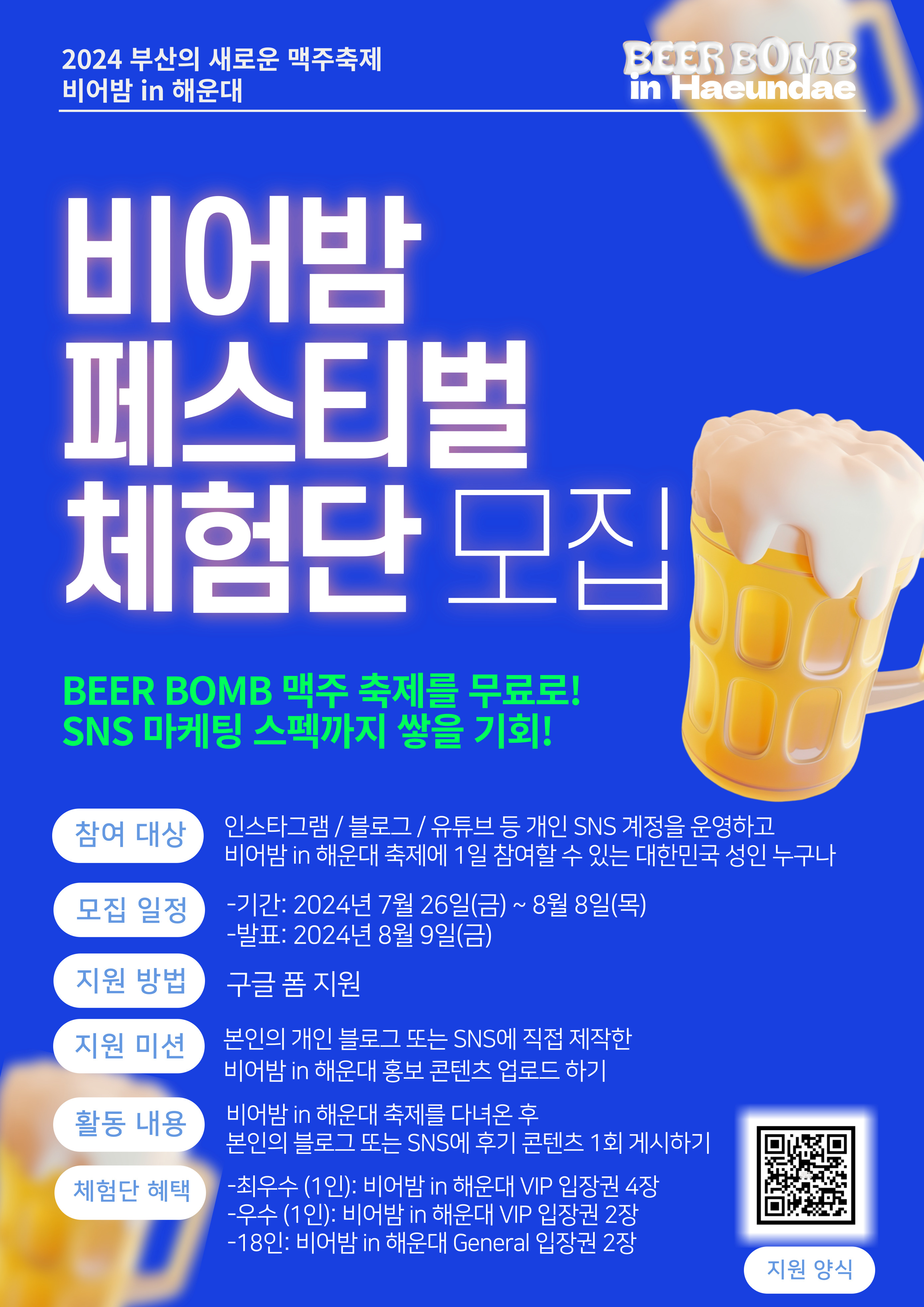 - 비어밤 in 해운대 기간 중 하루를 체험한 후, 본인의 개인 인스타그램 / 블로그 / 유튜브에 후기 콘텐츠 1회 게시하기