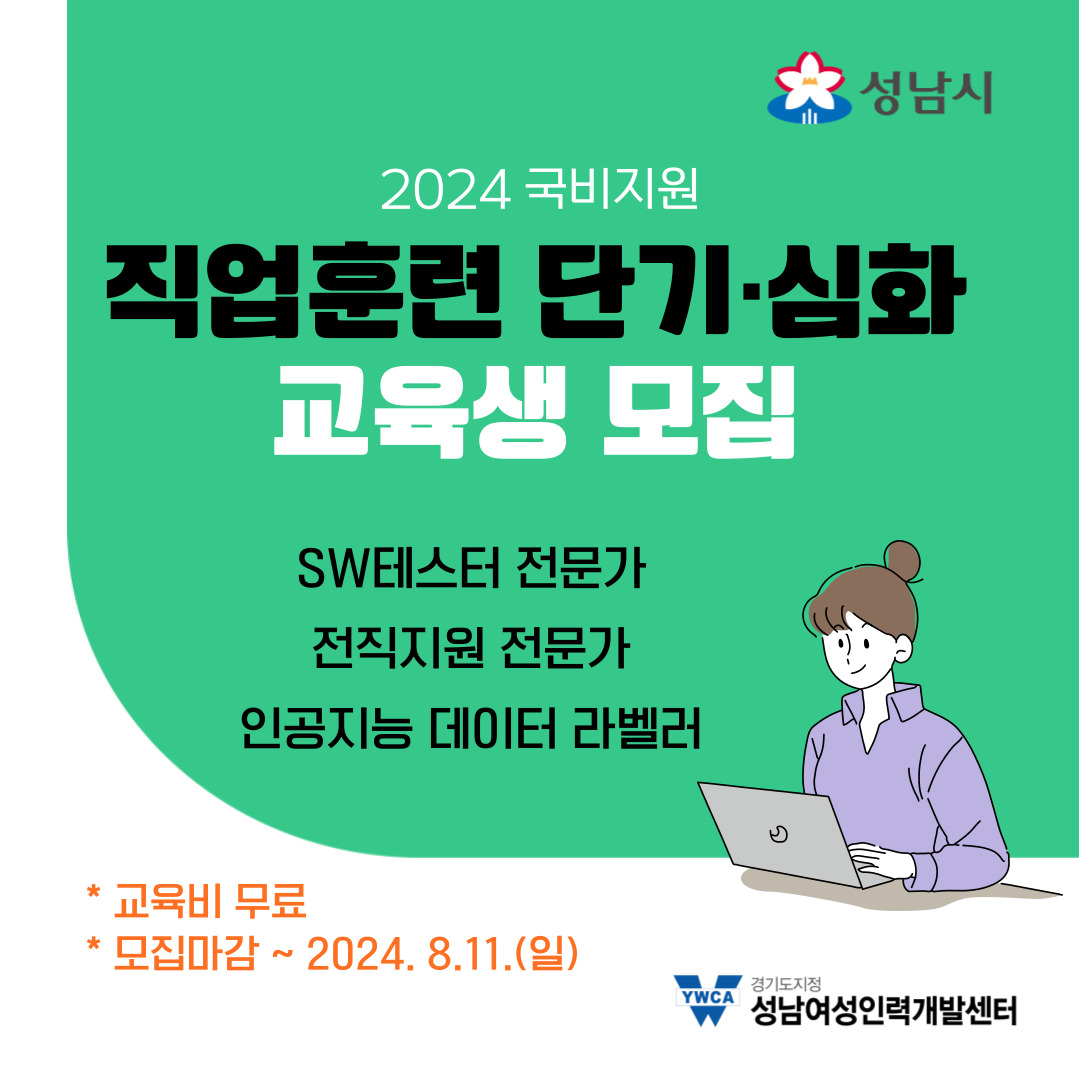 성남시지원으로 직업훈련 단기심화과정 교육생을 모집하고 있습니다. 실무교육으로 진행되며 관련 전문분야로 취업을 희망하는 미취업여성분들의 많은 관심과 참여 부탁드립니다.