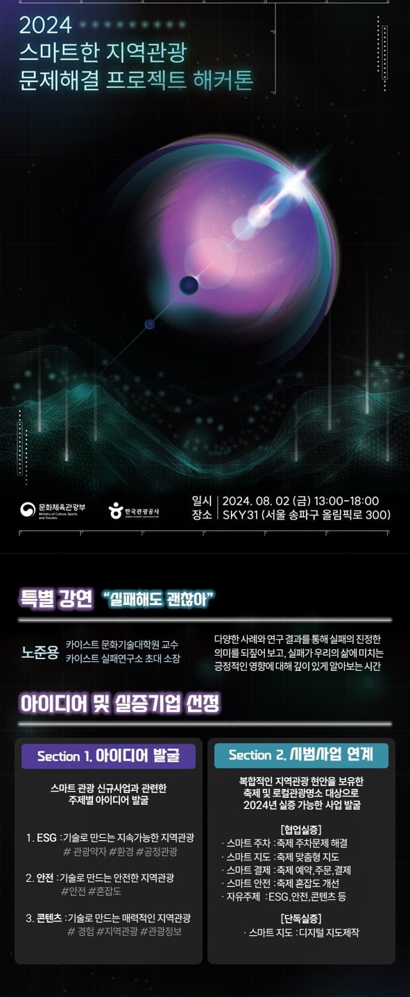 대학생분들의 새로운 스마트관광 아이디어와 열정 가득한 기업들의 발표현장에 여러분을 초대합니다‼ 노준용 교수님의 <실패해도 괜찮아> 특별 강연도 준비했으니 많은 관심 부탁드립니다😊