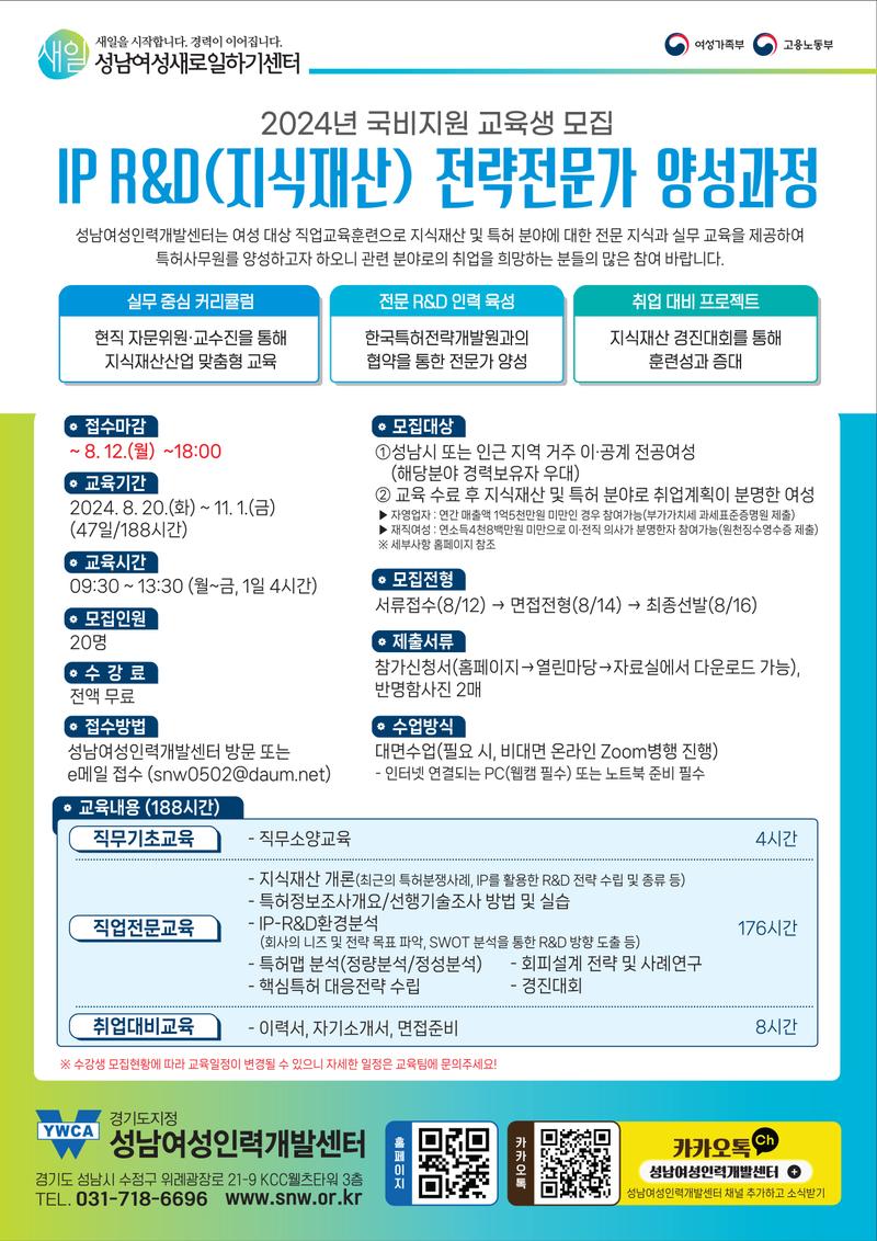 성남여성인력개발센터는 여성가족부 지원 직업교육훈련으로 한국특허전략개발원과 협력하여 지식재산 및 특허 분야에 필요한 지식과 실무 능력을 갖춘 IP-R&D 전문가를 양성하고자 하오니 관련 분야로의 취업을 희망하는 분들의 많은 참여 바랍니다.