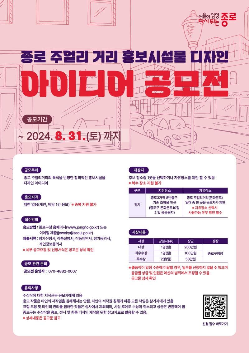 종로구는 주얼리산업의 발전과 집적지 홍보를 위해 종로3가역 일대 주얼리거리에 홍보시설물을 설치하고자 합니다. 이에 혁신적이고 독창적인 디자인 아이디어를 발굴하기 위해 종로 주얼리거리 홍보시설물 디자인 아이디어 공모전을 개최하고,공모기간을 연장하여 수정 공고하오니 많은 관심과 참여 바랍니다.