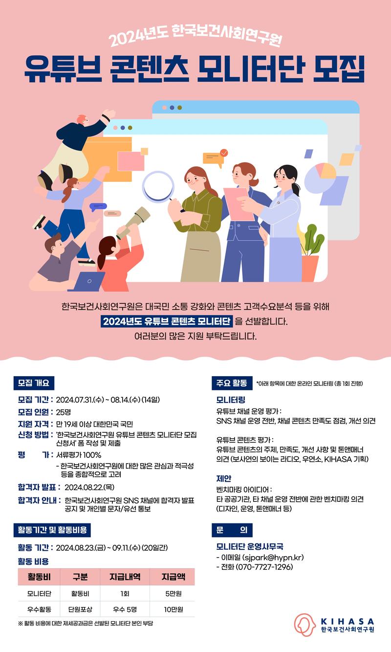 안녕하세요 한국보건사회연구원은 국민들의 목소리에 귀를 기울이고,더 개선된 콘텐츠를 제공하기 위해 2024년도 유튜브 콘텐츠 모니터단을 선발합니다.