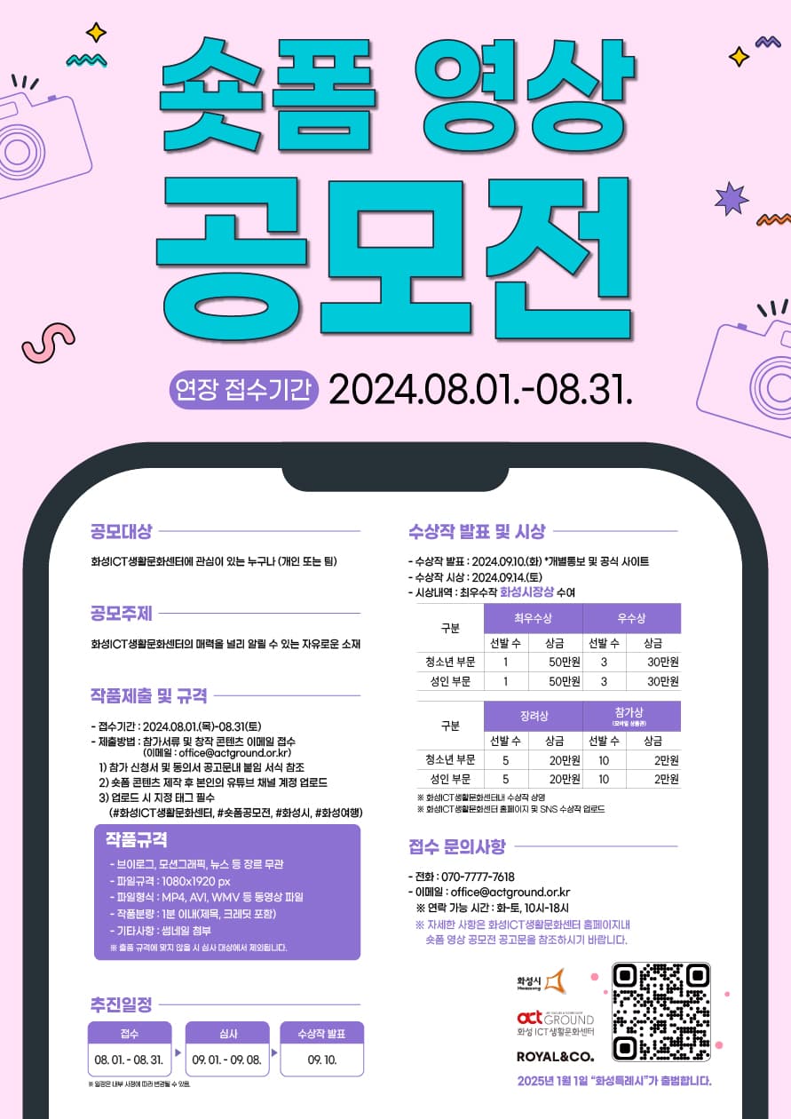 - 업로드 시 지정 태그 필수 : #화성ICT생활문화센터, #숏폼공모전, #화성시, #화성여행