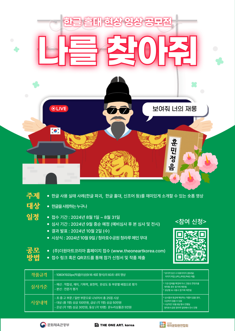 공모개요 : 2024 한글주간 문화예술행사 지원 사업의 일환으로 진행되는 '한글 홀대 현상을 알아보는 숏폼 영상 공모전 - 나를 찾아줘'는 한글 홀대 현상 (무분별하게 사용되는 외국어, 외래어, 한글파괴 현상 등) 사례에 대한 설명을 숏폼 영상으로 유쾌하게 풀어내어, 누구나 어렵지 않게 한글 사용 실태를 인식하고 이미지를 제고하고자 합니다.