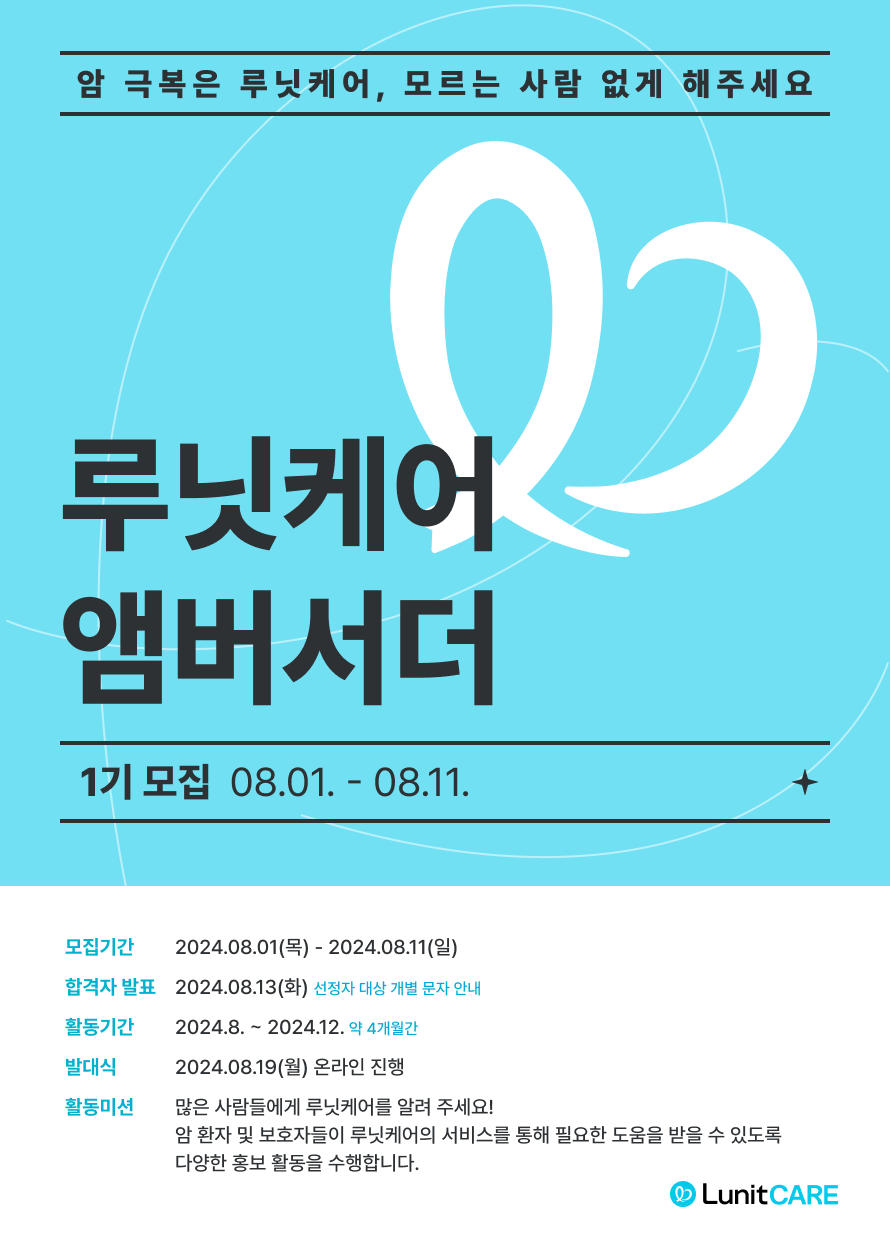 대한민국 1위 암전문 헬스케어, 루닛케어의 서비스를 널리 알려주실 앰버서더를 모집합니다!