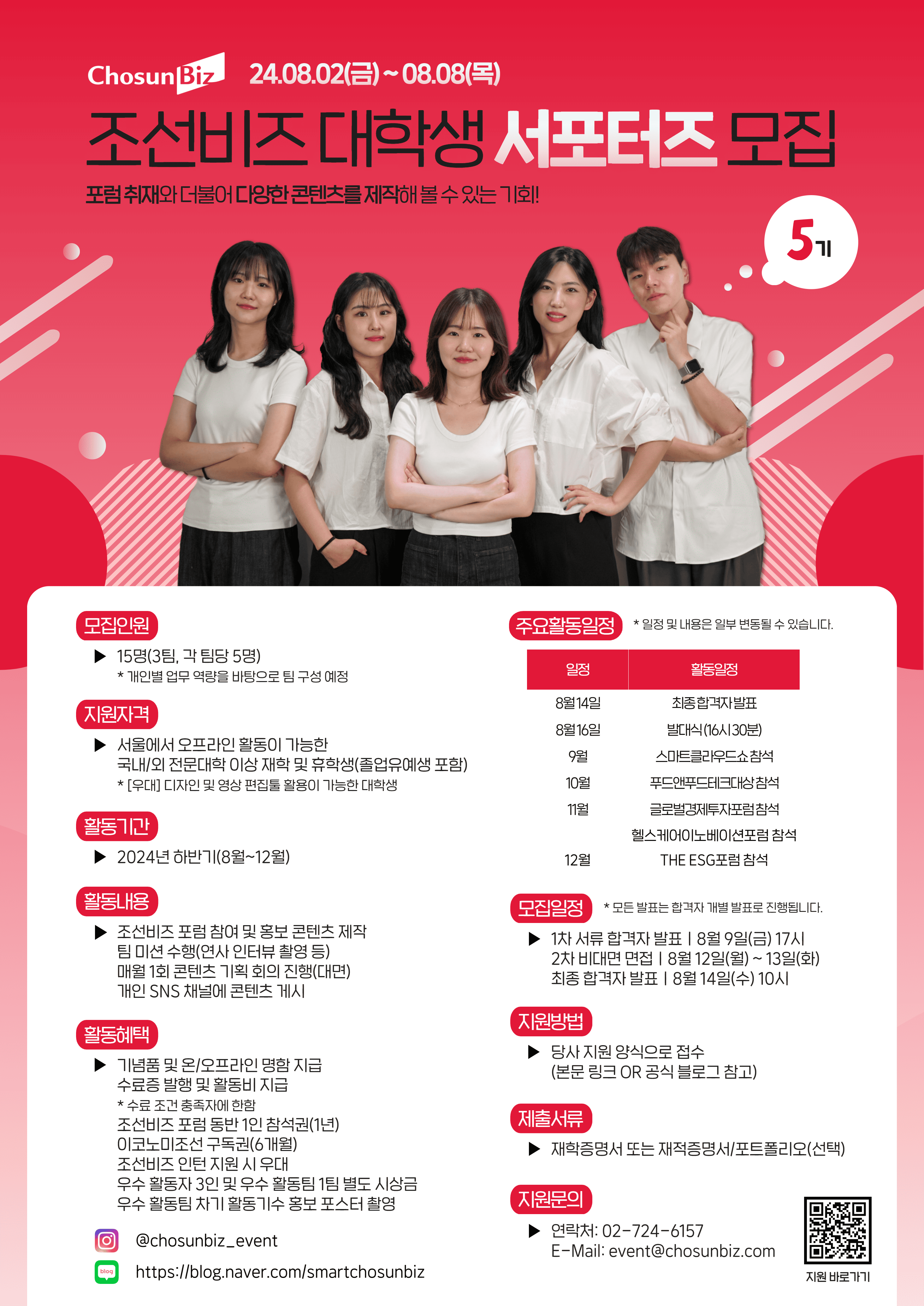 조선비즈 서포터즈는 조선비즈가 주최, 주관화는 다양한 행사 현장을 직접 취재하며 다양한 콘텐츠를 제작해볼 수 있는 대외활동입니다.