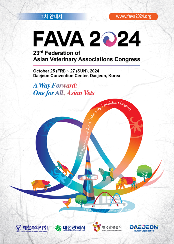 아시아 수의사회연맹(Federation of Asian Veterinary Association, 이하 FAVA)과 대한수의사회 주최로 제23차 아시아‧태평양 수의사회 총회(23rd Federation of Asian Veterinary Associations Congress, 이하 FAVA 2024)가 2024년 10월 25일(금)부터 27일(일)까지 "A Way Forward: One for All, Asian Vets"을 주제로 대전컨벤션센터에서 개최됩니다.