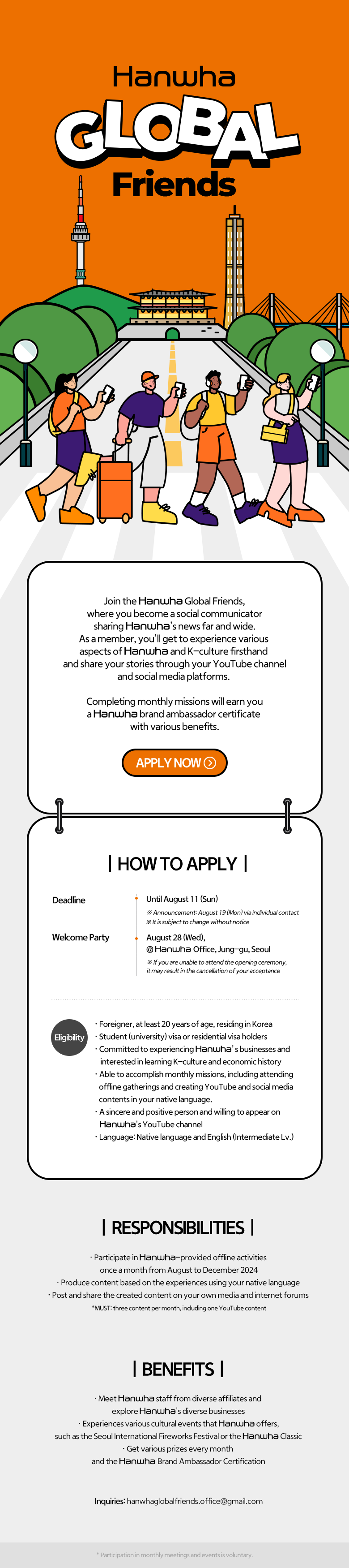 If you have any inquires, please contact ▶ hanwhaglobalfriends.office@gmail.com