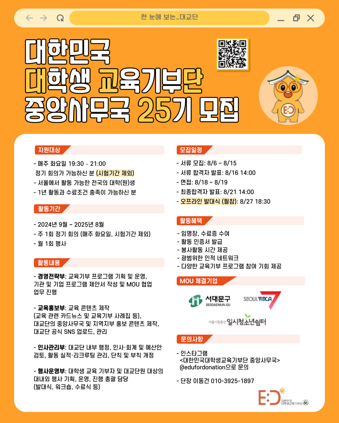 전국 최대 교육기부 단체, ⭐대한민국대학생교육기부단⭐에서 함께 할 25기 “중앙사무국” 부원을 모집합니다‼