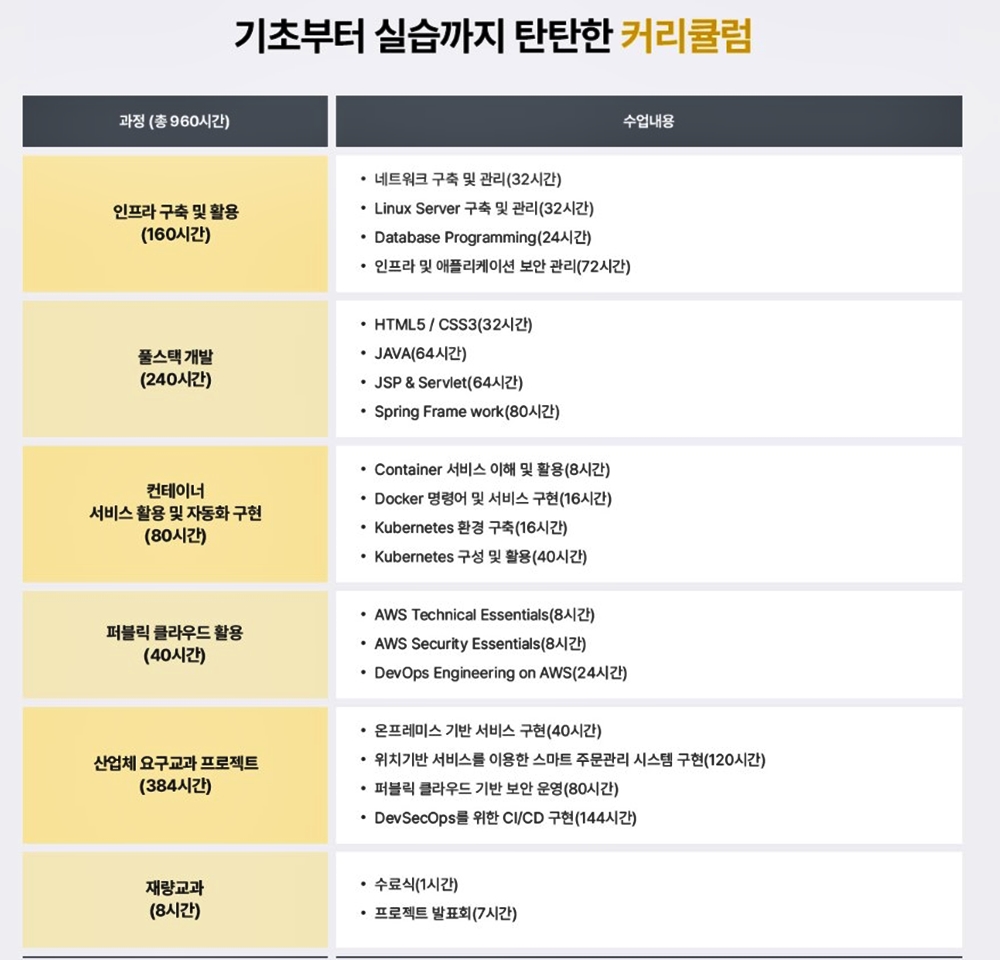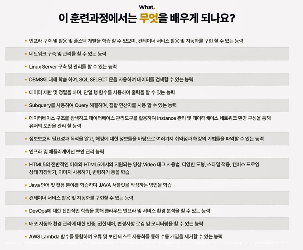 - 인프라 구축 및 활용 및 풀스택 개발을 학습할 수 있으며, 컨테이너 서비스 활용 및 자동화를 구현 할 수 있는 능력