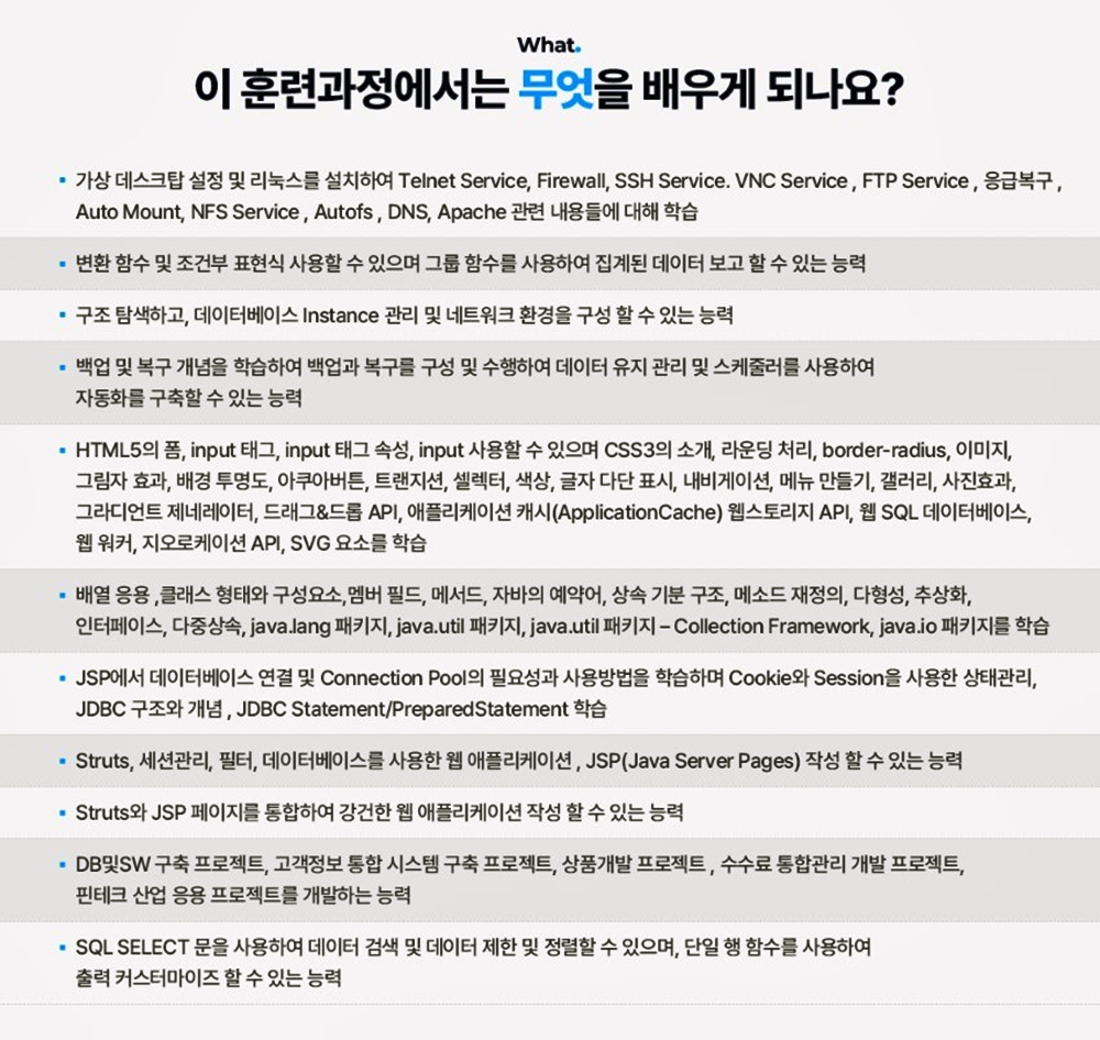- Struts, 세션관리, 필터, 데이터베이스를 사용한 웹 애플리케이션, JSP(Java Server Pages) 작성 할 수 있는 능력