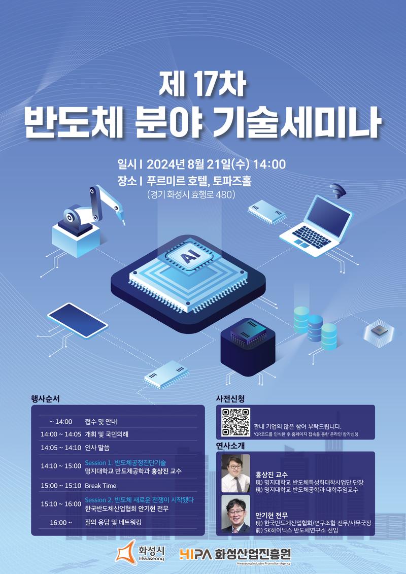 행사명: 제 17차 반도체 분야 기술 세미나 주최/주관: 화성시/화성산업진흥원 일시: 2024.08.21 (수) 14:00 장소: 푸르미르 호텔, 토파즈 홀 (경기 화성시 효행로 480) 참가신청: 하단링크 접속 후 사전접수 https://fairpass.co.kr/RunEventInfo?eventcode=2294