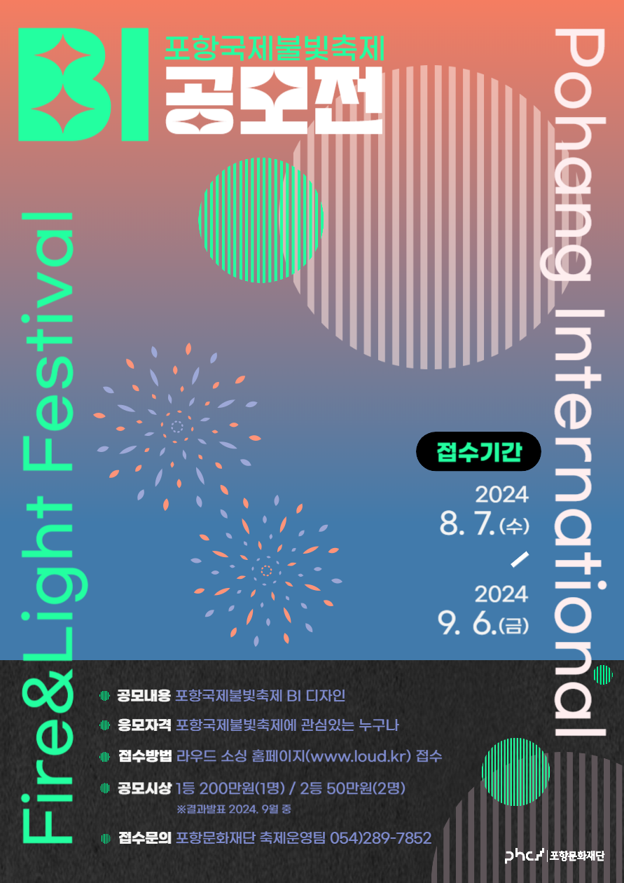 본 재단은 포항시민의 문화예술 향유 기회 제공과 지역내 문화관광축제를 기획 및 운영하고 있습니다. 이번 <포항국제불빛축제> BI 공모를 통해 축제의 브랜딩을 강화하고 정체성을 확립하는데 목적이 있습니다.