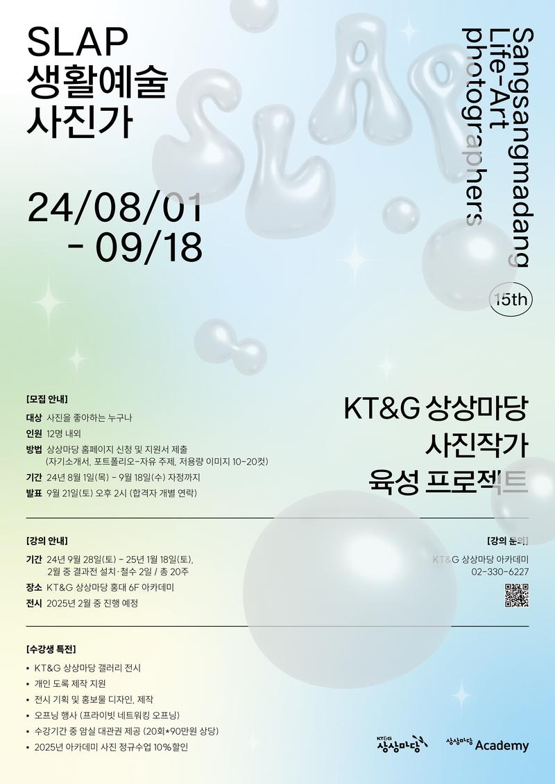 올해로 15회를 맞이하는 KT&G SLAP은 상상마당 생활예술사진가(Sangsangmadang Life-Art photographers)의 줄임말로, 사진을 매체로 심도 있는 취미활동을 하거나 작업의 스펙트럼을 넓히고자 하는 작가, 혹은 작가 지망생, 사진 애호가 등 모든 아마추어 사진가를 위한 교육 프로그램입니다. 아날로그와 디지털 사진 작업에 관한 강의와 조별 밀착 멘토링이 진행되며, 각 작업에 맞는 프린트 기법 강의가 진행됩니다. 사진 기본 이론과 프린트마스터, 현대 사진작가의 특강을 제공하며, 끝까지 수강하신 분들에 한해 KT&G 상상마당 갤러리에서 전시 기회가 제공됩니다.