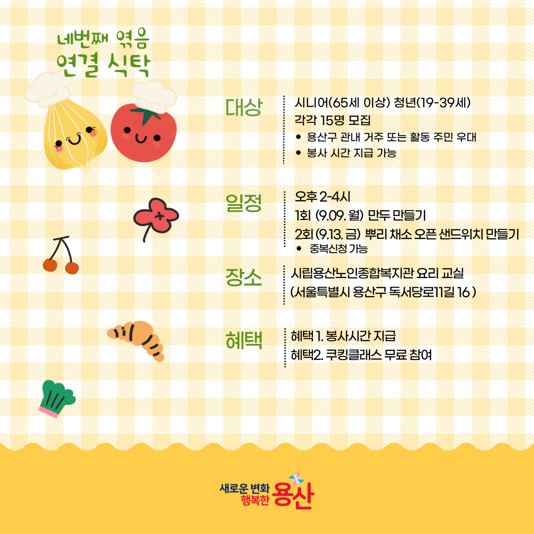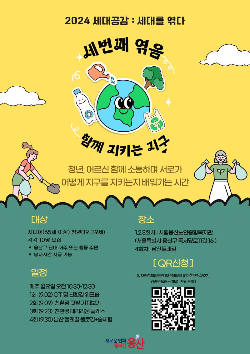 🫰<함께 지키는 지구> 친환경 체험형 봉사 프로그램 참여자 모집! *봉사시간 지급 가능합니다. 🙋이번에 용산구청과 함께하는 용산 시니어-청년이 함께 소통하며 진행되는 참여형 프로그램입니다. 청년, 시니어 서로가 생각하고 실천하는 친환경 활동 궁금하지 않으신가요? 함께 생각을 공유하고 경험해보는 시간입니다. ⠀ 💪 지원안내 💪 📍 일정 : 매주 월요일 오전 10:30-12:30 ☑️ 1회 (9.02) OT 및 친환경 워크숍 ☑️2회 (9.09) 친환경 텃밭 가꿔보기 ☑️3회 (9.23) 친환경 테리리움 클래스 ☑️4회 (9.30) 남산 둘레길 플로깅+숲체험 📍신청 방법 -카드뉴스 내 QR링크 활용 -구글폼 지원서 작성 https://forms.gle/yQqr4WtwYC6zsg3B9 📍 장소 1,2,3회차 : 시립용산노인종합복지관 (서울특별시 용산구 독서당로11길 16 ) 4회차 : 남산둘레길 📍 혜택 봉사 활동 시간 지급 가능 📍 모집대상&인원 ❗️청년 : 10명 / 어르신 : 10명❗️(프로그램당 10명씩) ⭐️ 용산구 거주 혹은 활동하는 (활동한 적이 있는) 만 19 ~ 39세 청년 우대 ⭐️ 시니어 세대와 진정성 있는 소통을 하고 싶은 청년 보다 보람찬 참여형 봉사 활동을 경험하고 싶은 청년 📍 모집기간 ~09월 01일 (참가비는 없습니다😳) *모집현황에 따라 조기 마감될 수 있습니다. |