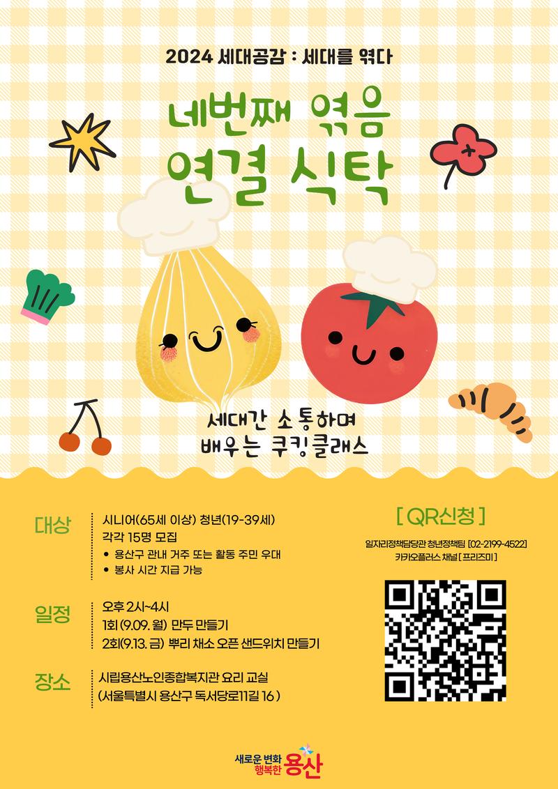 🫰<연결 식탁> 쿠킹클래스 프로그램 참여자 모집! *봉사시간 지급 가능합니다. 🙋이번에 용산구청과 함께하는 용산 시니어-청년이 함께 소통하며 진행되는 참여형 프로그램입니다. 추석전! 시니어 선생님들에게 요리를 배워보자! 그리고 가져가 보자! ⠀ 💪 지원안내 💪 📍 일정 : 오후 2시~4시 *중복 신청 가능 1회 (9.09. 월) 만두 만들기 ☑️2회 (9.13. 금) 뿌리 채소 오픈 샌드위치 만들기 📍신청 방법 -카드뉴스 내 QR링크 활용 -구글폼 지원서 작성 https://forms.gle/d5FnihFAws7GumwN8 📍 📍 장소 시립용산노인종합복지관 요리 교실 (서울특별시 용산구 독서당로11길 16 ) 📍 혜택 봉사 활동 시간 지급 가능 📍 모집대상&인원 ❗️청년 : 10명 / 어르신 : 10명❗️(프로그램당 10명씩) ⭐️ 용산구 거주 혹은 활동하는 (활동한 적이 있는) 만 19 ~ 39세 청년 우대 ⭐️ 시니어 세대와 진정성 있는 소통을 하고 싶은 청년 보다 보람찬 참여형 봉사 활동을 경험하고 싶은 청년 📍 모집기간 ~09월 01일 (참가비는 없습니다😳) *모집현황에 따라 조기 마감될 수 있습니다. |