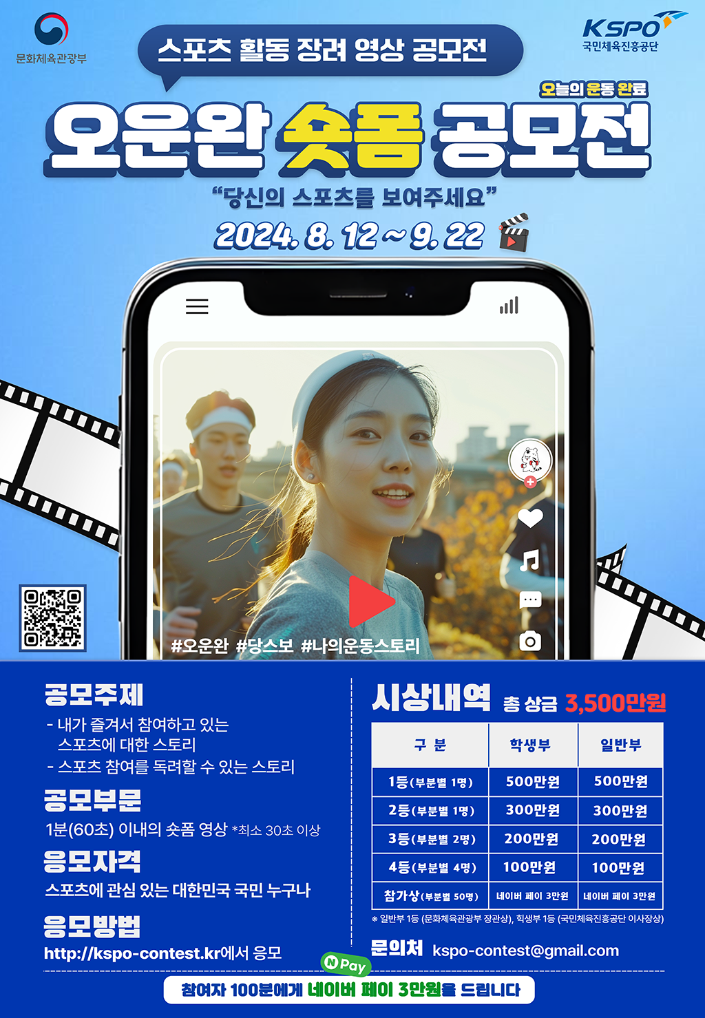 공모주제는 스포츠를 장려하는 스토리라면, 어떤 숏폼 영상이든 상관없습니다.