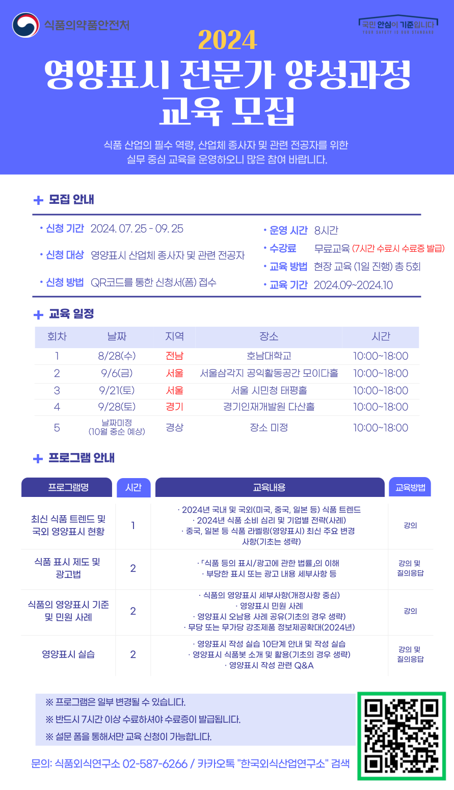 식품의약품안전처에서 주관하는 [2024 영양표시 전문가 양성과정] 교육 모집합니다!