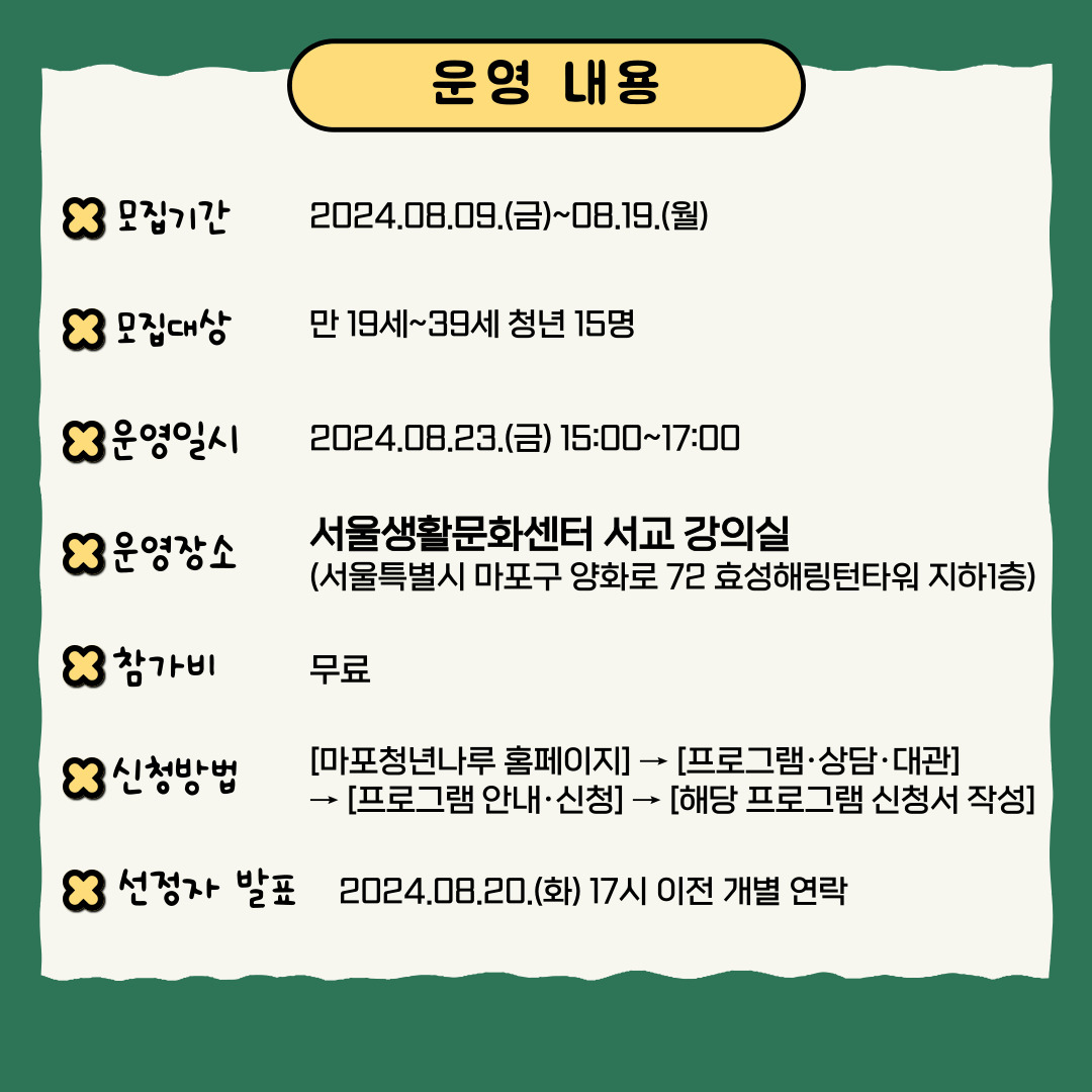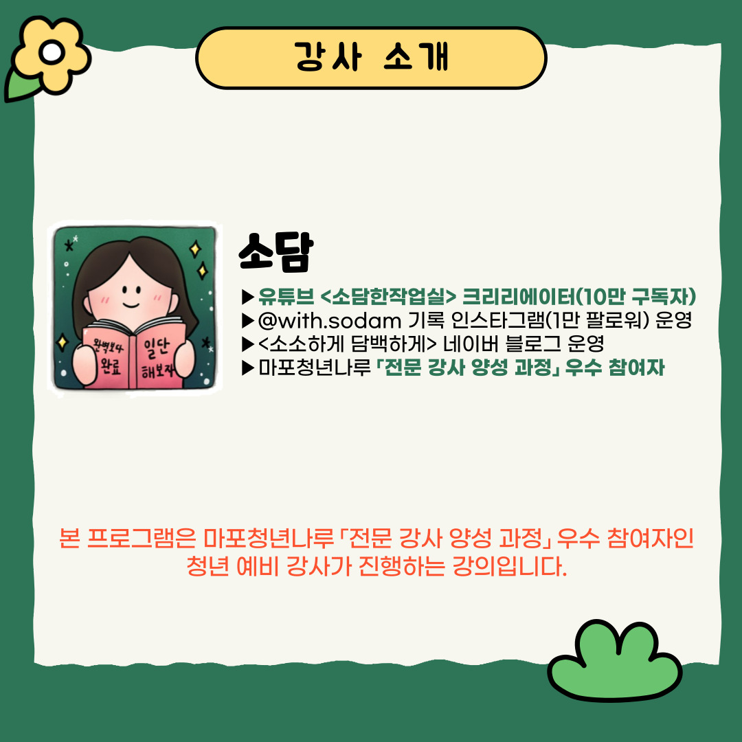 *본 프로그램은 마포청년나루 「전문 강사 양성 과정」 우수 참여자인 청년 예비 강사가 진행하는 강의입니다.