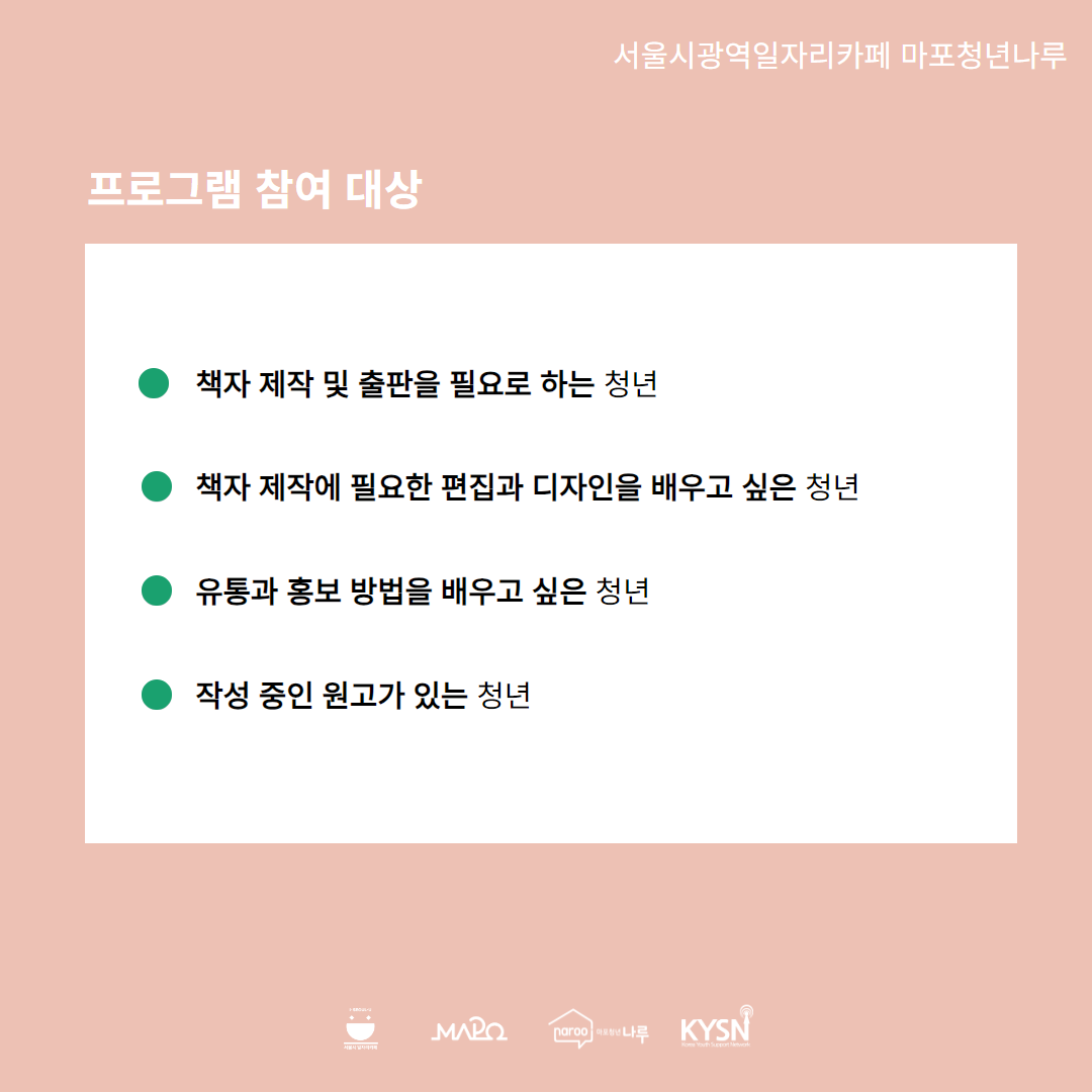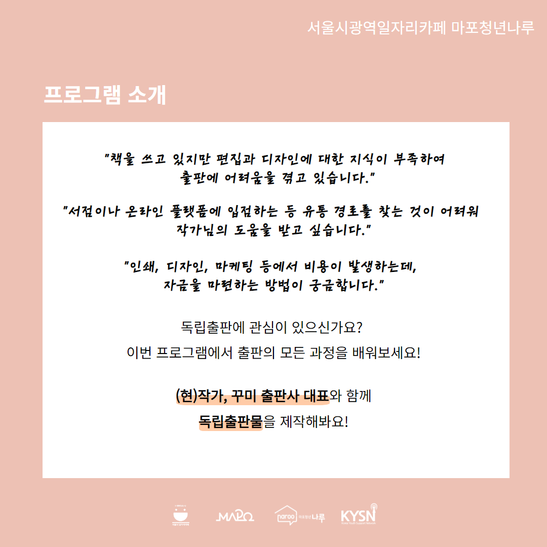 작년에 참가자분들의 많은 관심으로 상반기, 하반기에 진행되었던 독립출판 프로그램이