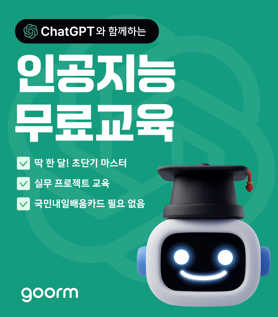 Zoom에서 실시간 온라인으로 진행되는 무료 인공지능 부트캠프입니다. 취·창업을 지원하며 선발절차에 코딩테스트는 없습니다. ChatGPT를 전문적으로 활용하고 싶은 분께 추천드리며 ChatGPT, 텐서플로우, 케라스, 딥러닝, 어텐션, 트랜스포머 등을 배울 수 있습니다.