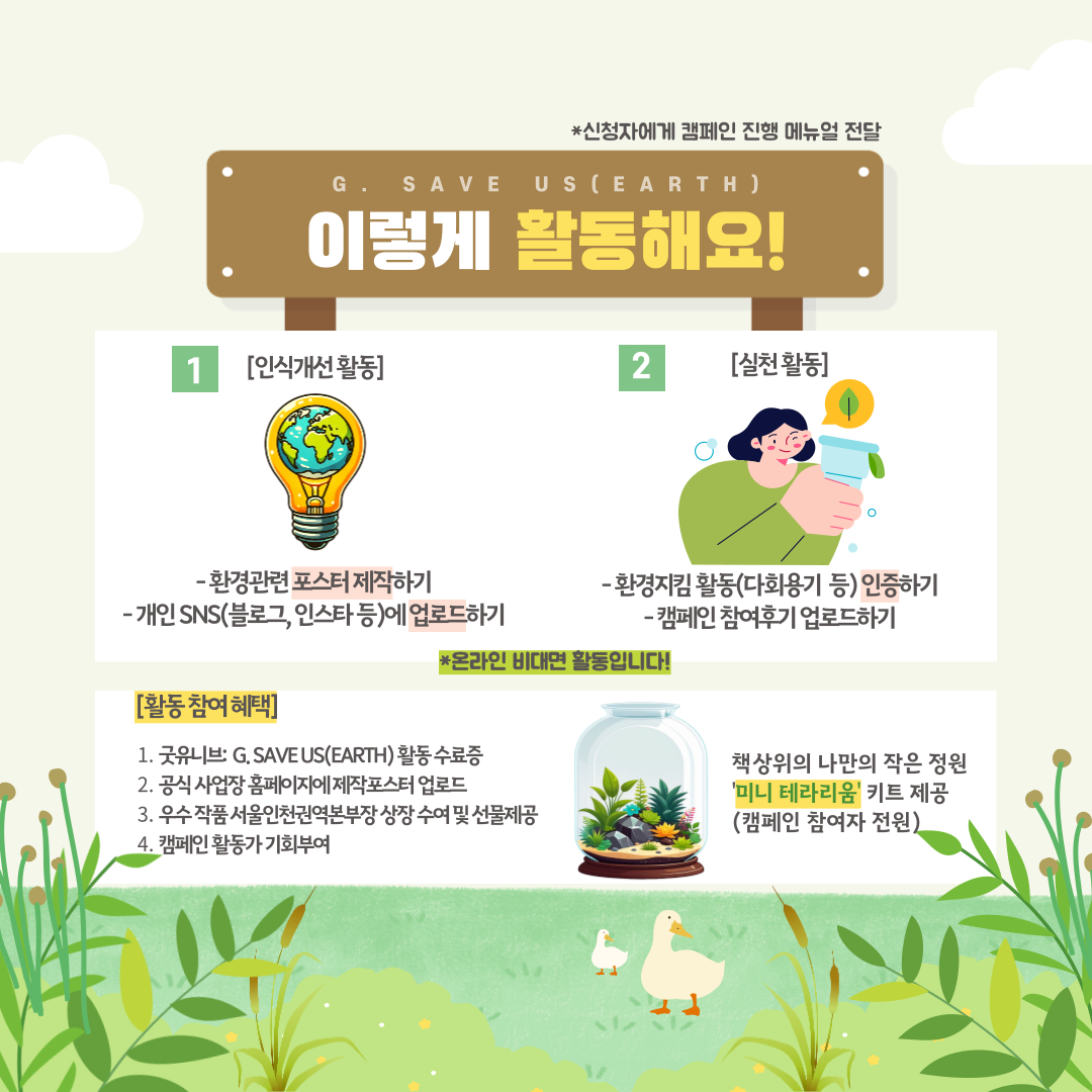 G.Save US(earth)는 사람들의 인식 개선을 이끌어내는 [홍보 활동] 과 동시에 환경 지킴 [실천 활동]까지 수행해볼 수 있는 하이브리드형 활동입니다.