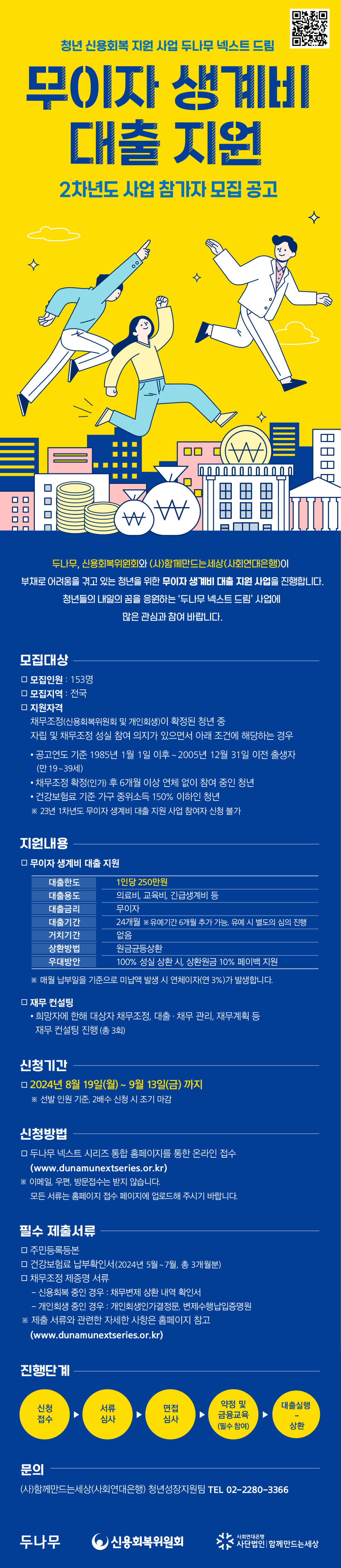 두나무, 신용회복위원회와 (사)함께만드는세상(사회연대은행)이 부채로 어려움을 겪고 있는 청년을 위한 무이자 생계비 대출 지원 사업을 진행합니다.