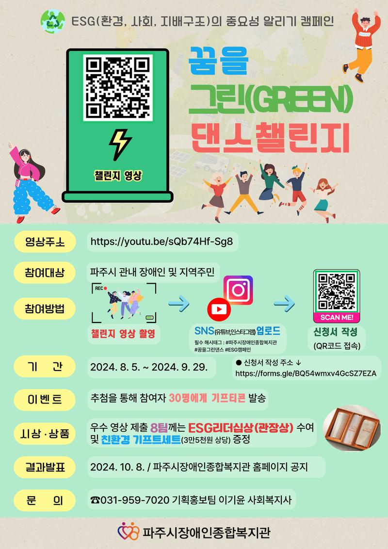 파주시장애인종합복지관에서 ESG 경영실천사업 '꿈을 그린(GREEN) 댄스 챌린지'를 진행합니다! 본 캠페인은 누구나 따라할 수 있는 쉬운 춤을 활용한 '챌린지'활동으로 환경보호(Environmental), 사회(Social), 지배구조(Governance)의 중요성을 널리 알리고 일상생활에서의 ESG활동 실천 독려를 위해 진행됩니다.