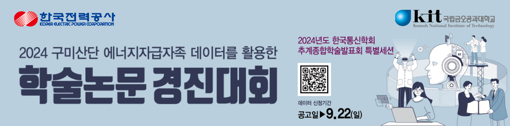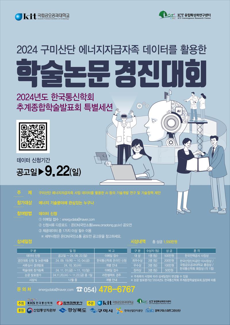 한국전력공사 및 한국통신학회'가 주최하고 '국립금오공과대학교 ICT융합특성화연구센터'에서 주관하는 『2024 구미산단 에너지자급자족 데이터를 활용한 학술논문 경진대회』를 개최하오니 많은 참여 바랍니다.