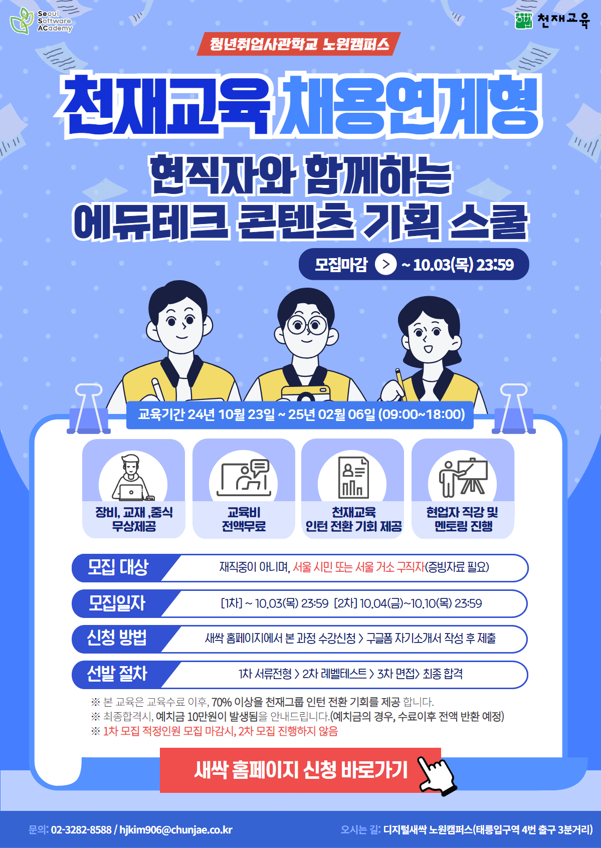 [서울시 청년취업사관학교 노원캠퍼스 에듀테크 콘텐츠 기획 스쿨 1기 교육생 모집 - 교육비 전액 무료! 천재교육 채용연계과정!