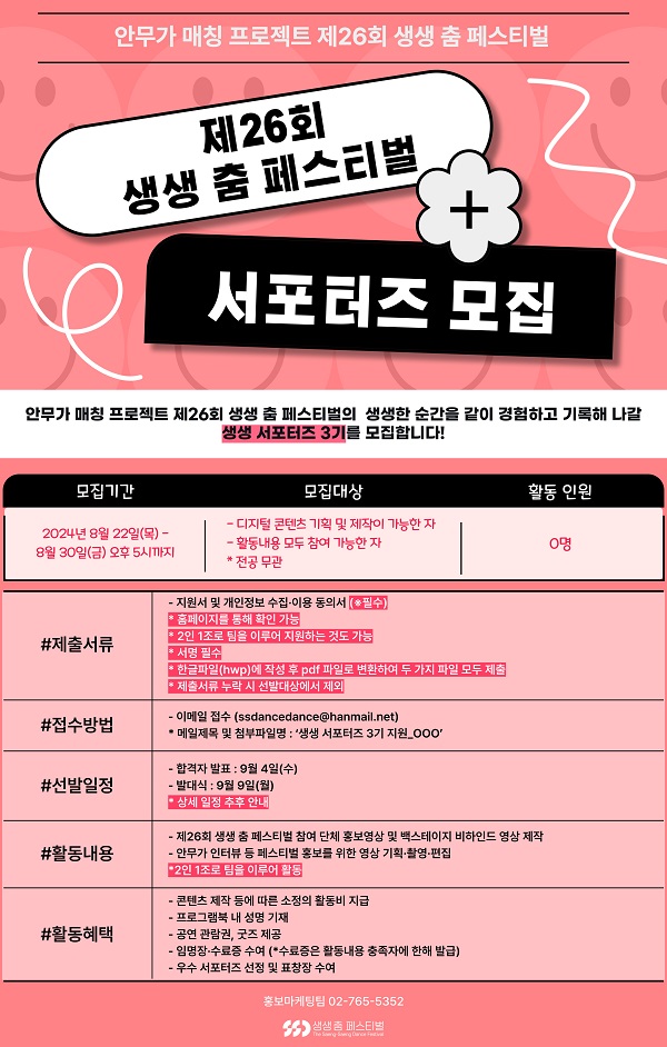 (사)한국현대무용협회 안무가 매칭 프로젝트 제26회 생생 춤 페스티벌 생생 서포터즈 3기 모집