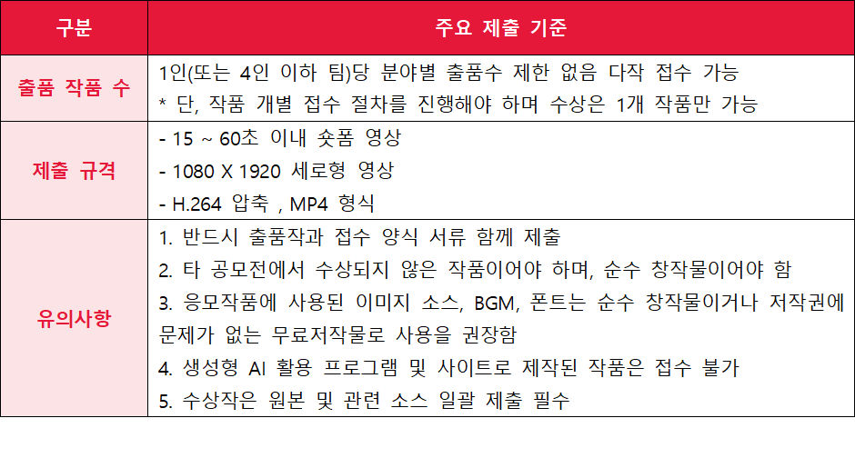 - 생성형 AI 활용 프로그램 및 사이트로 제작된 작품은 접수 불가능함. 수상 후 발견될 시 수상을 취소하고 상장, 상금을 환수함